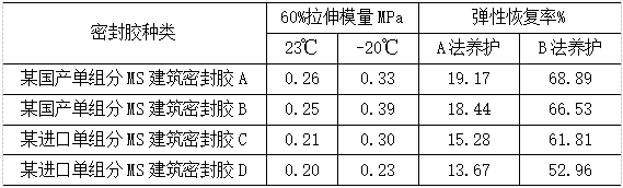 單組分MS建筑密封膠的基礎(chǔ)聚合物反應(yīng)活性相對較低,徹底反應(yīng)完全所需時間相對較長,如果標(biāo)準(zhǔn)給定的養(yǎng)護時間不夠,基團反應(yīng)不徹底,密封膠內(nèi)部交聯(lián)程度不夠,彈性恢復(fù)率表現(xiàn)較低。采用JC/T 881-2001[7]對比4款國內(nèi)外MS建筑密封膠彈性回復(fù)率測試結(jié)果可知,按照A法養(yǎng)護,測試結(jié)果(見表3)不符合標(biāo)準(zhǔn)要求,采用GB/T 22083-2008[8]對單組分MS建筑密封膠進行分級,最高只能符合該標(biāo)準(zhǔn)中的12.5 P類型產(chǎn)品要求,結(jié)果為塑性材料,而實際的MS建筑密封膠為彈性密封膠,明顯欠妥;如果按照B法養(yǎng)護,彈性恢復(fù)率可達到60%以上,符合GB/T 22083-2008標(biāo)準(zhǔn)中的20LM類型產(chǎn)品要求,測試結(jié)果為彈性材料。綜上所述,由于現(xiàn)今沒有專門針對MS建筑密封膠應(yīng)用的標(biāo)準(zhǔn),套用按應(yīng)用領(lǐng)域或分級界定的標(biāo)準(zhǔn)明顯欠妥,使得單組分MS建筑密封膠在建筑市場領(lǐng)域,尤其是PC外墻密封領(lǐng)域推廣異常困難。