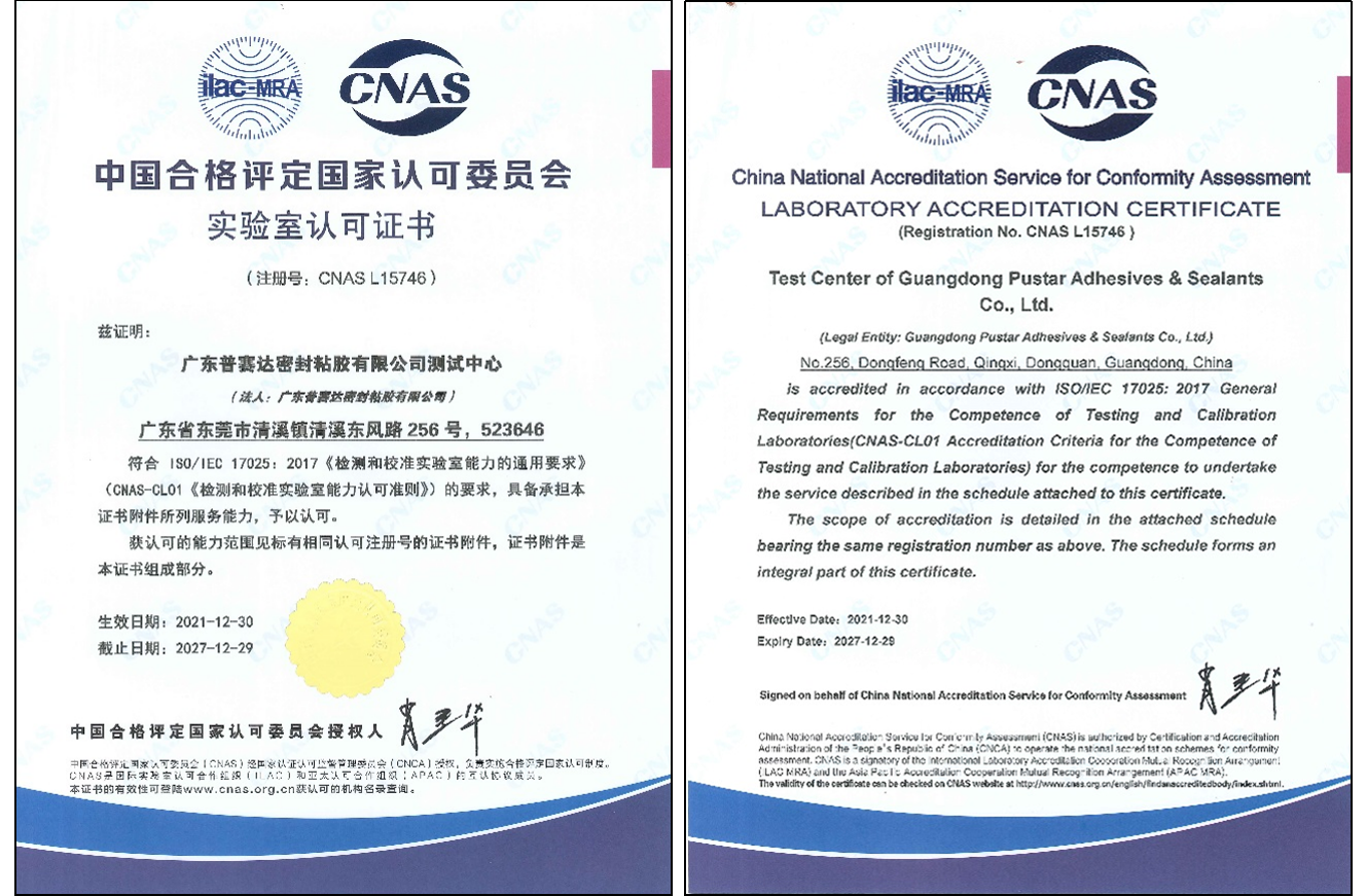 On December 30, 2021, Guangdong Pustar Sealant & Adhesive Co., LTD. Test Center (hereinafter referred to as "PUSTAR Test Center") successfully passed the accreditation of China National Accreditation Service for Conformity Assessment (CNAS) and obtained the Laboratory Accreditation Certificate of China National Accreditation Service for Conformity Assessment (Registration number: CNAS L15746), marking that the Psyche test Center has the national recognized laboratory management level and inspection and testing ability.